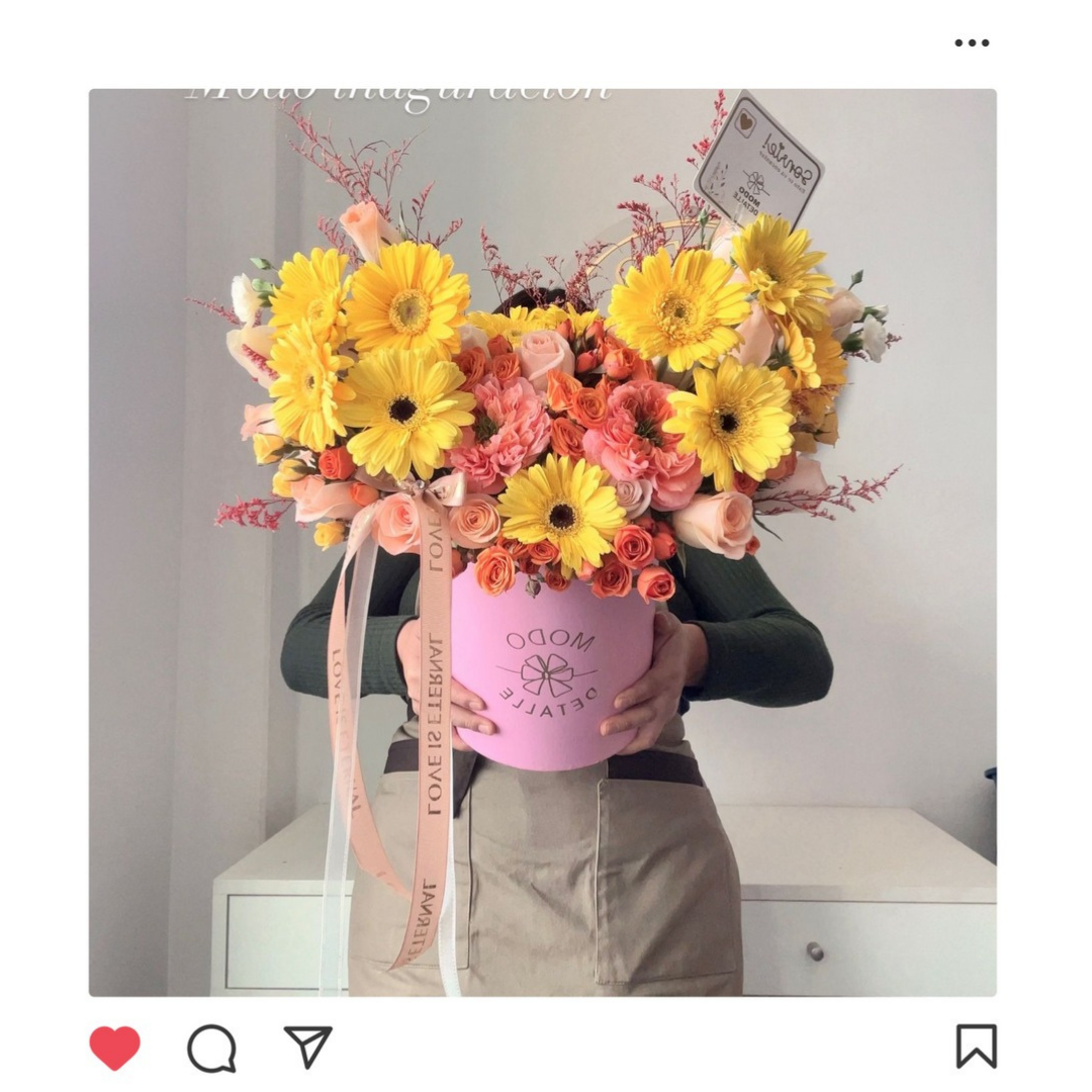 Una caja floral abundante y colorida que incluye 30 rosas, minirosas, hojas secas y 10 gerberas, ideal para un regalo alegre y lleno de vida.