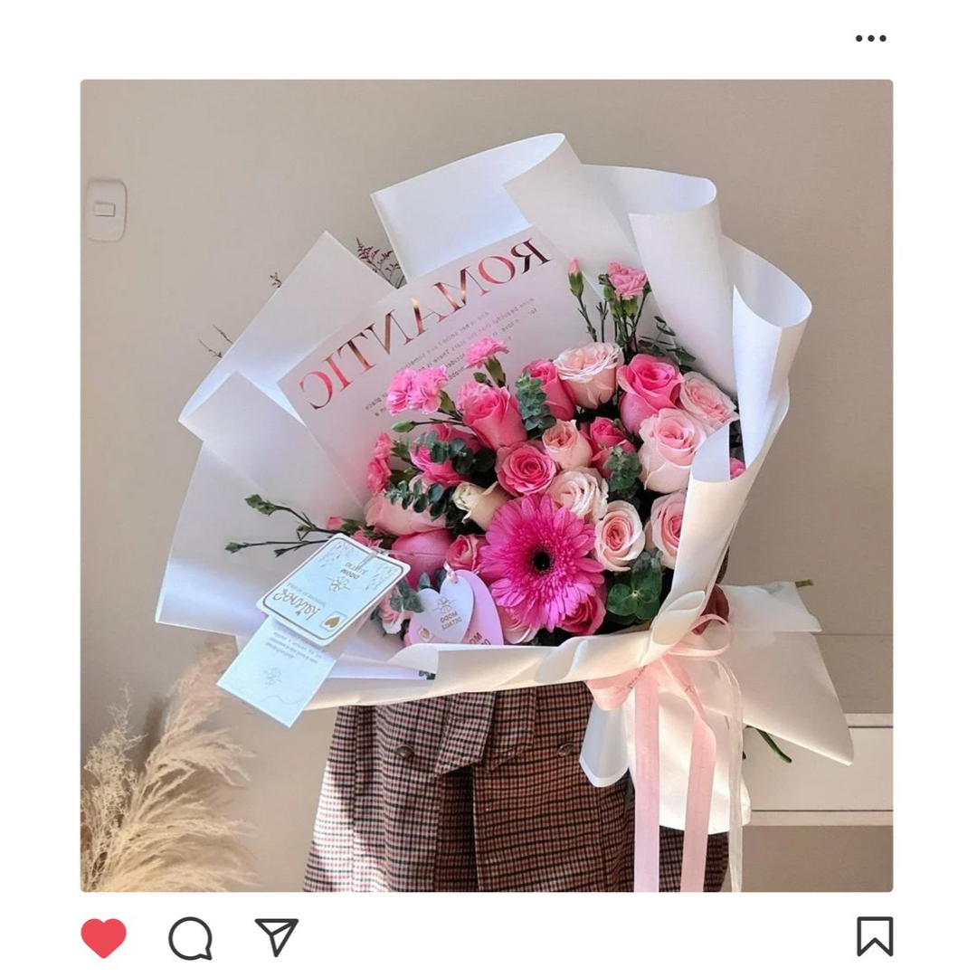 Un ramo equilibrado y elegante con 18 rosas, claveles, 1 gerbera y silver, perfecto para expresar cariño con estilo.