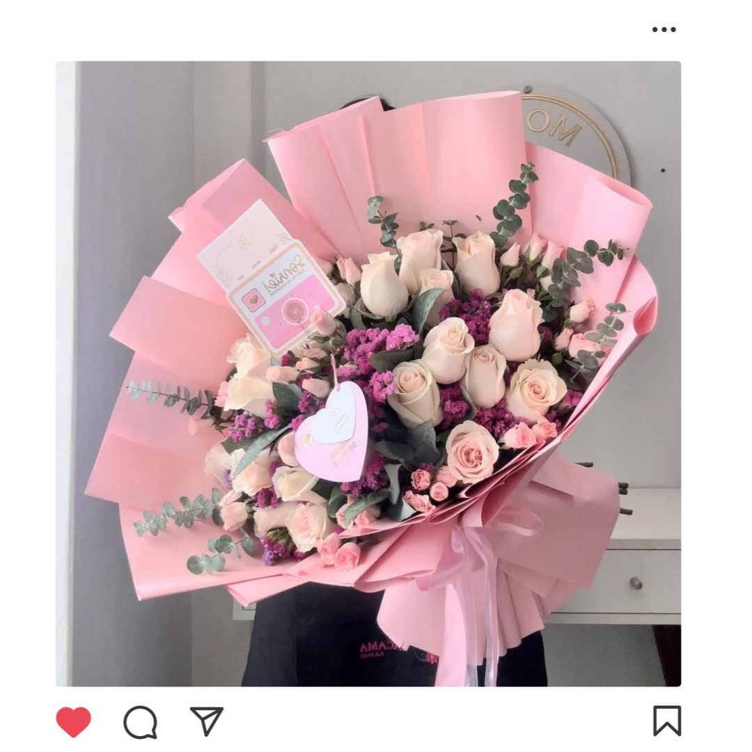 Un ramo elegante con 20 rosas, statis, silver y minirosas, ideal para regalar dulzura y sofisticación.