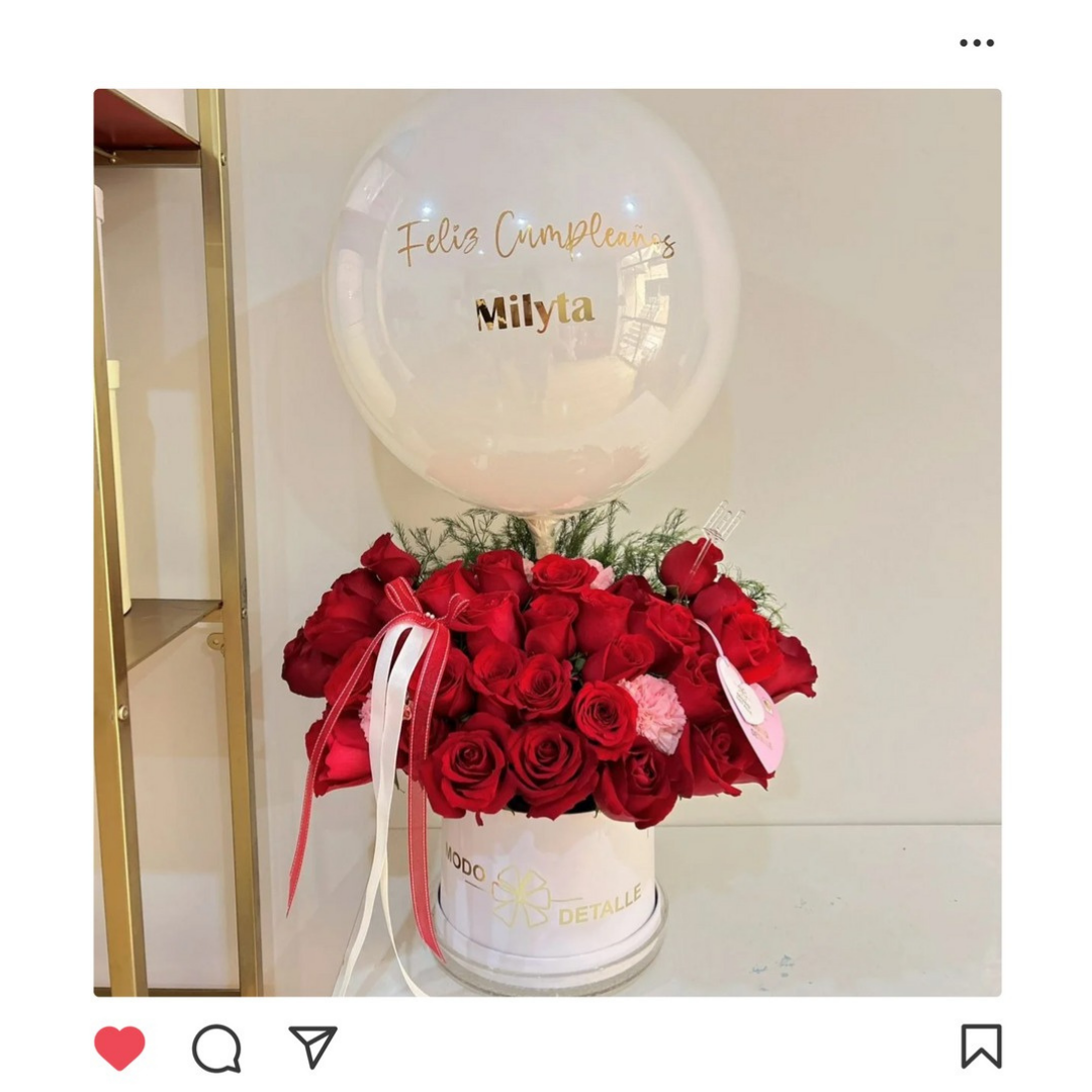 Una caja floral impactante que incluye 40 rosas, espárragos, silver y globo personalizado, ideal para celebraciones especiales y mensajes personalizados.