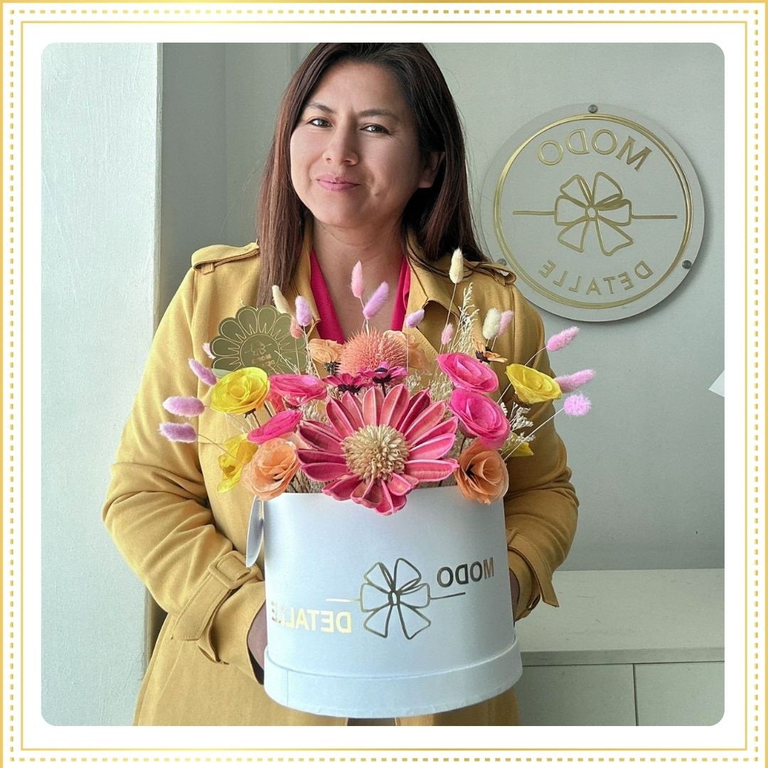 Detalle de flores preservadas en caja color blanco, lleva jaspias , lunarias ,margaritas , girasol rosado y conejitos .