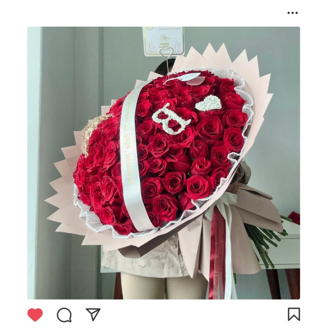Un ramo extraordinario de 100 rosas, ideal para declaraciones de amor únicas. Incluye cinta personalizada, haciendo de este arreglo un regalo exclusivo y memorable.